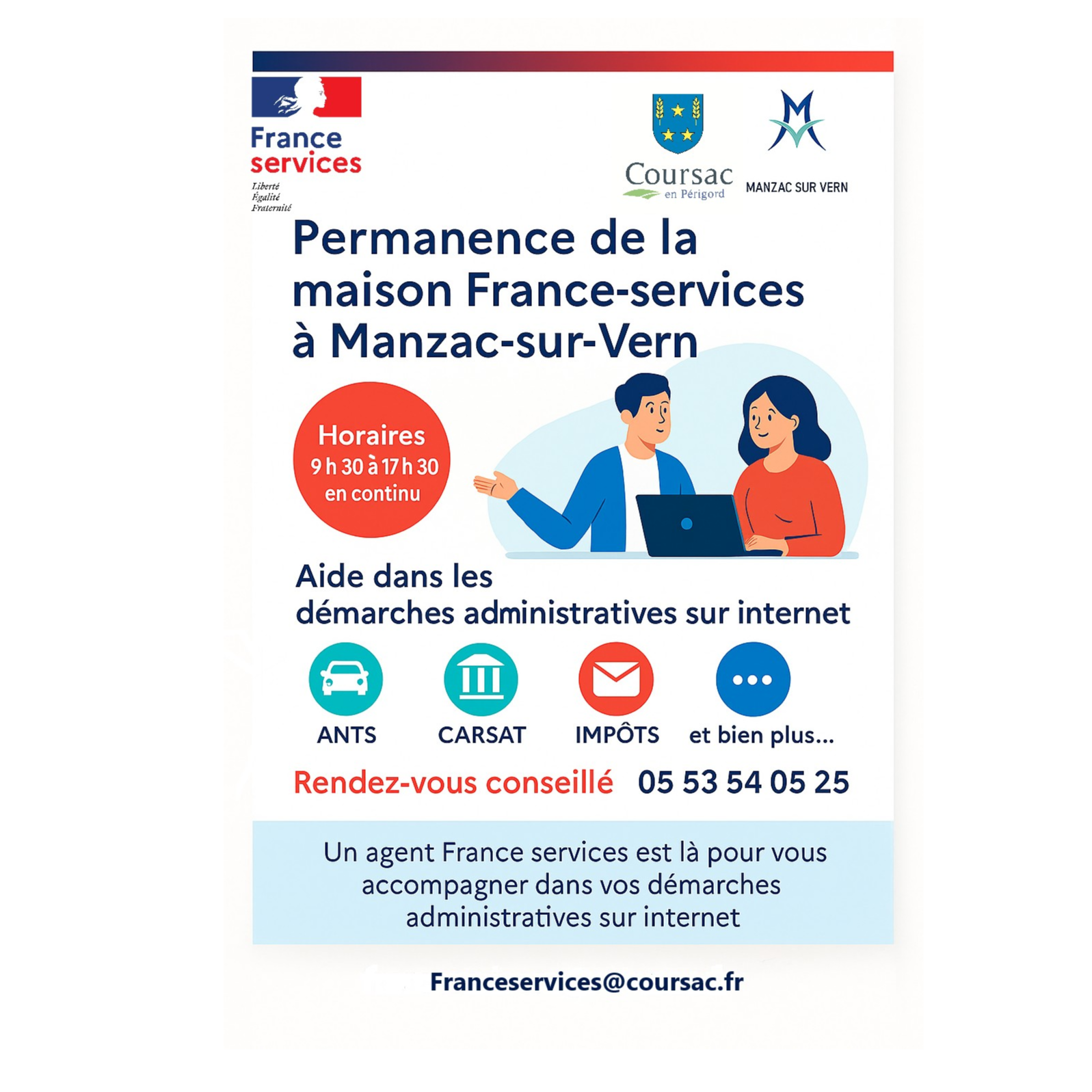 Deux jours par mois, un agent de la Maison France Services de Coursac tiendra une permanence à Manzac-sur-Vern.